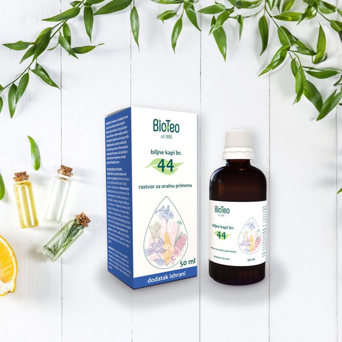 Biljne kapi br. 44 su dodatak ishrani na bazi ekstrakata herbe majčine dušice, lista bokvice, lista plućnjaka i herbe divizme. Herba majčine dušice i list bokvice doprimnose zdravlju gornjih disajnih puteva, pomažu uklanjanju bronhijalnog sekreta i štite sluzokožu respiratornih puteva. List plućnjaka i herba divizme doprinose zdravlju gornjih disajnih puteva.