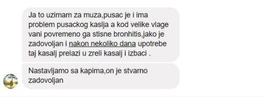 Sastojci: vodeno-etanolni ekstrakti herbe majčine dušice, lista bokvice, herbe plućnjaka i herbe divizme.