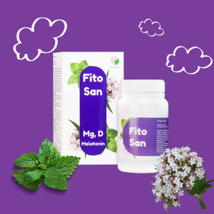 Namena: FITOSAN je dodatak ishrani na bazi ekstrakata lista matičnjaka i korena odoljena. Bogat je izvor vitamina D. Sadrži magnezijum i melatonin. List matičnjaka i koren odoljena pomažu kod nesanice, za mentalno zdravlje, opuštanje i lakše uspavljivanje, za održanje dobre kognitivne funkcije. Vitamin D ima ulogu u procesu deobe ćelija i doprinosi normalnoj apsorpciji i iskorišćenju kalcijuma i fosfora, normalnom nivou kalcijuma u krvi, normalnoj funkciji imunog sistema i održavanju normalne funkcije mišića.