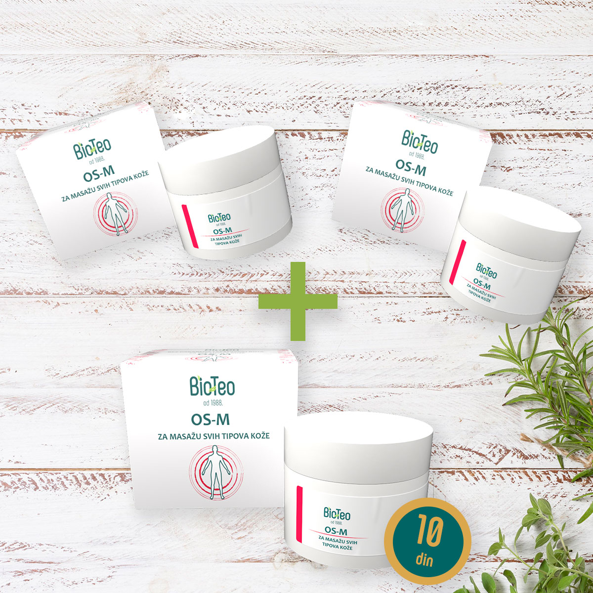 BIOTEO OS-M jedinstven je biljni melem kreiran po originalnoj recepturi na bazi prirodnih sastojaka namenjen za masažu svih tipova kože. Poboljšava epitelizaciju, drenažu i regeneraciju tkiva. Povoljno deluje kod otoka, hematoma, preloma, sportskih povreda i posttraumatskih stanja.